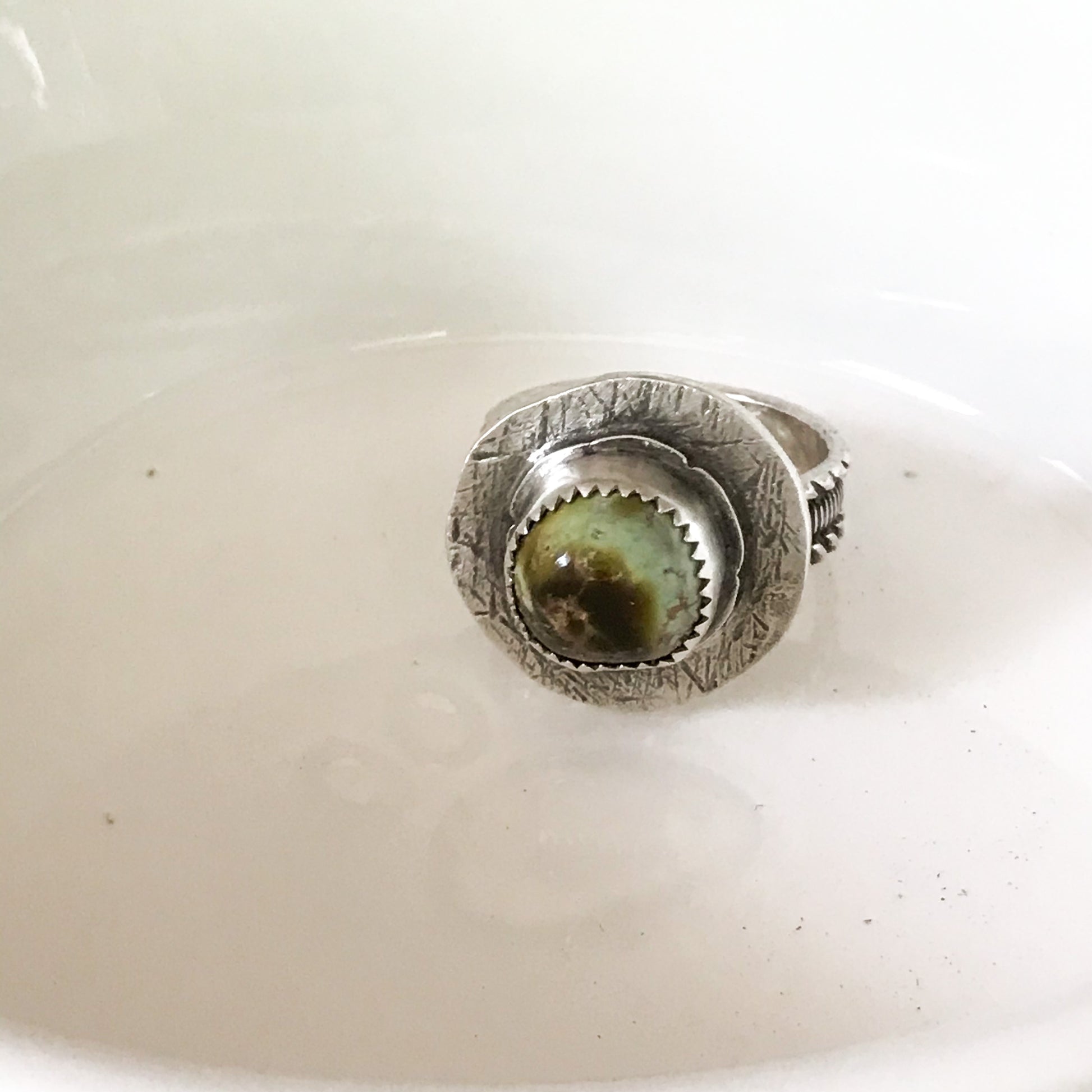 Damele turquoise cabochon set in a sterling silver ring. The silver is textured on the top base plate and has a decorative band.