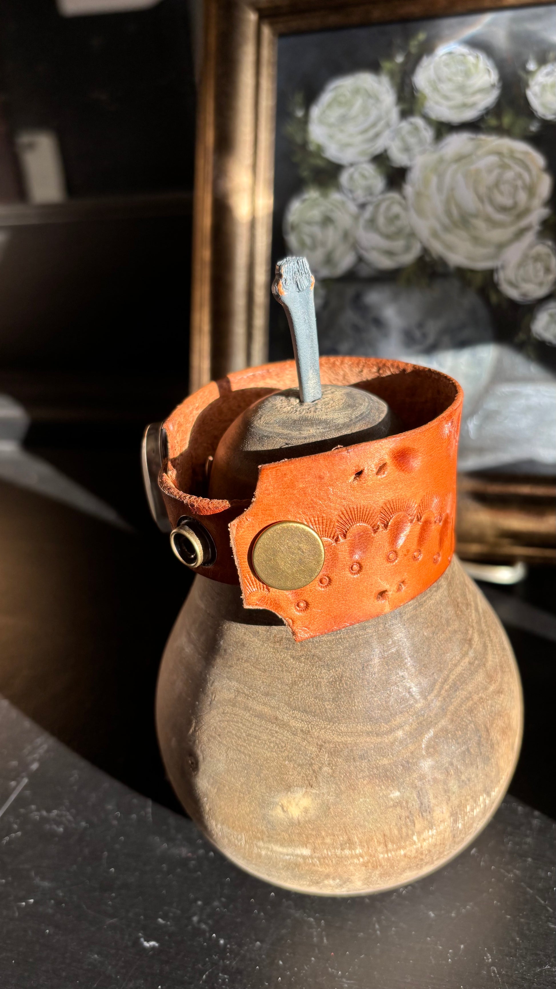 Hemimorphite white stone set in sterling silver on a hand tooled leather bracelet