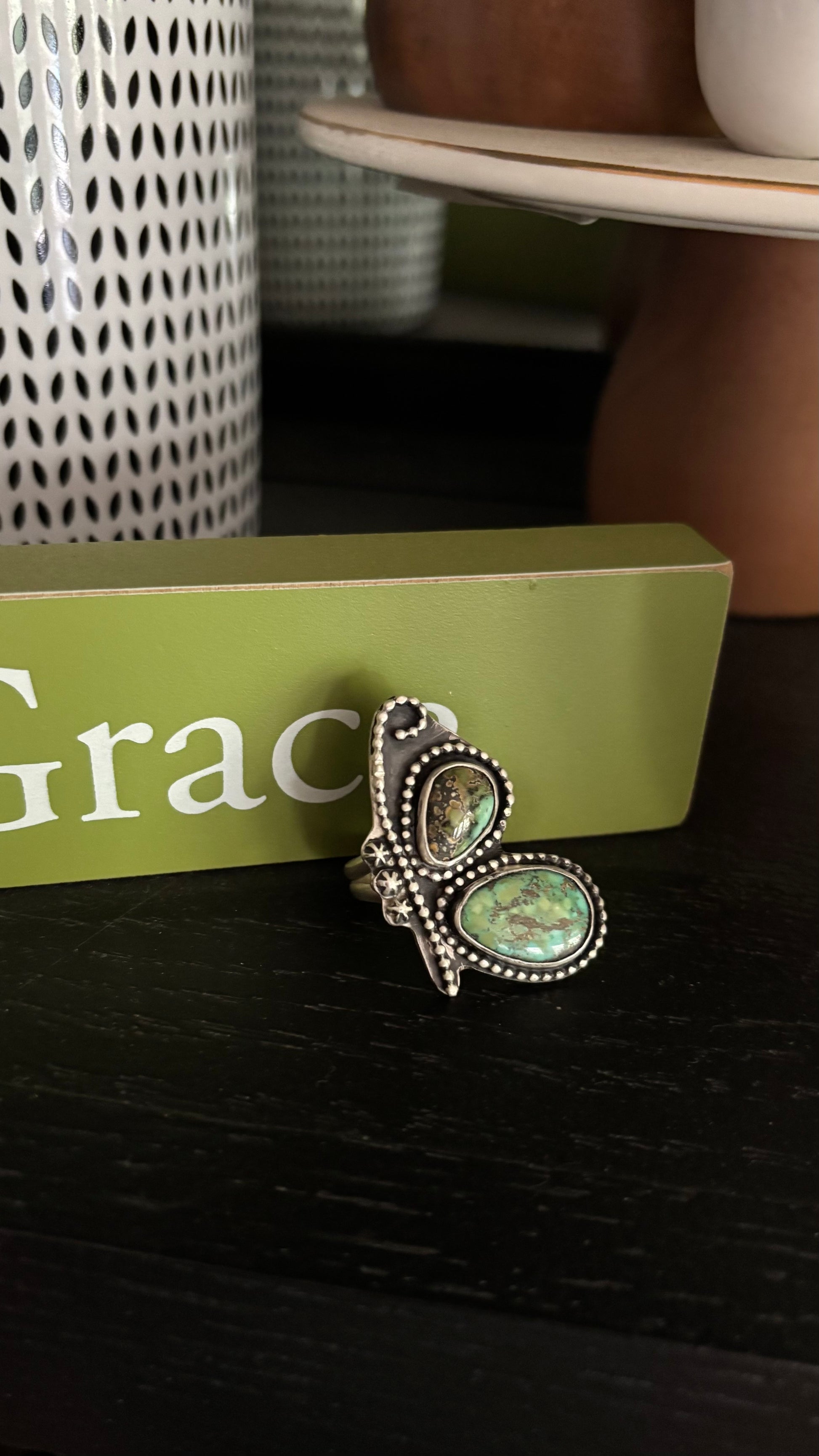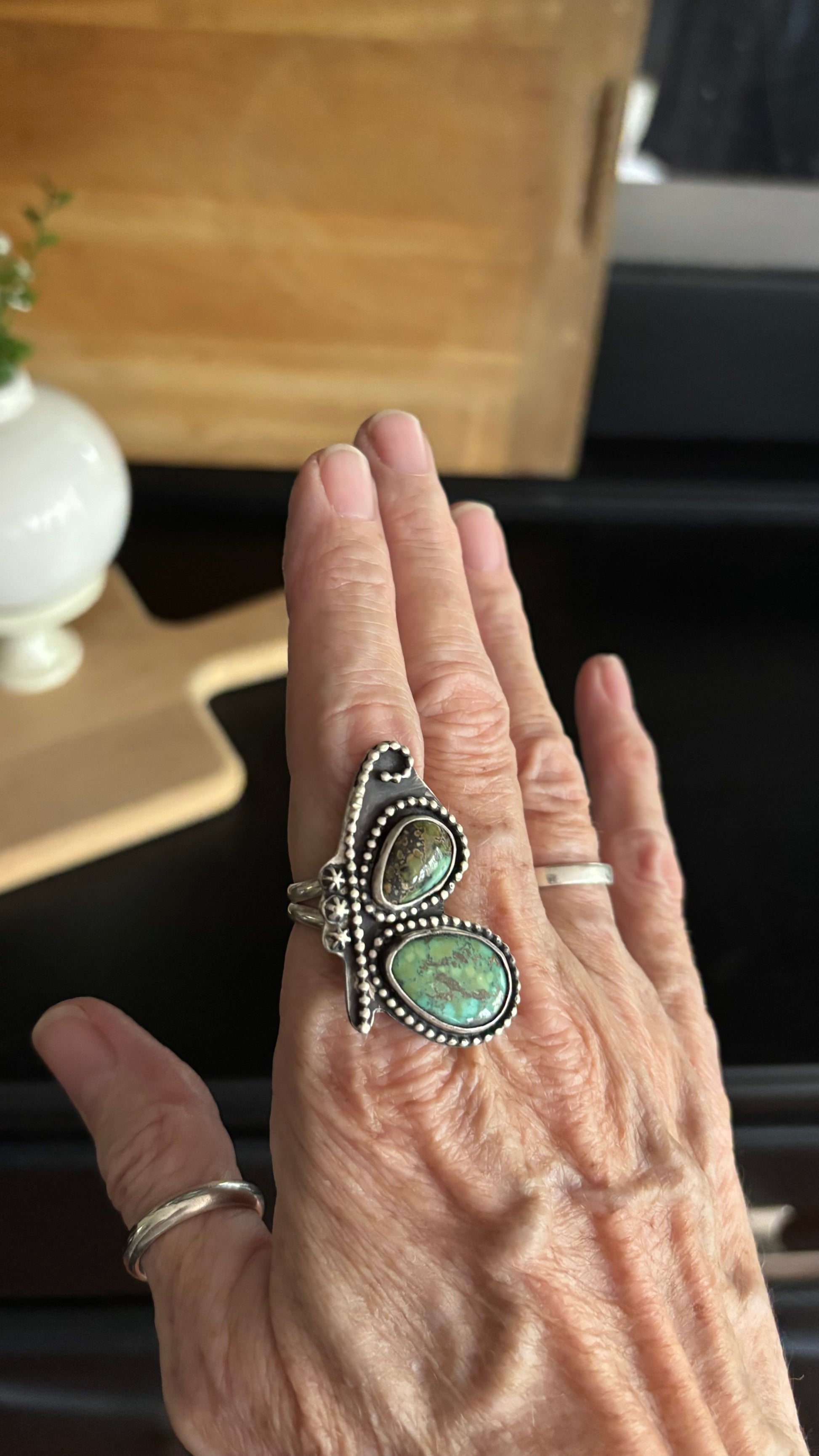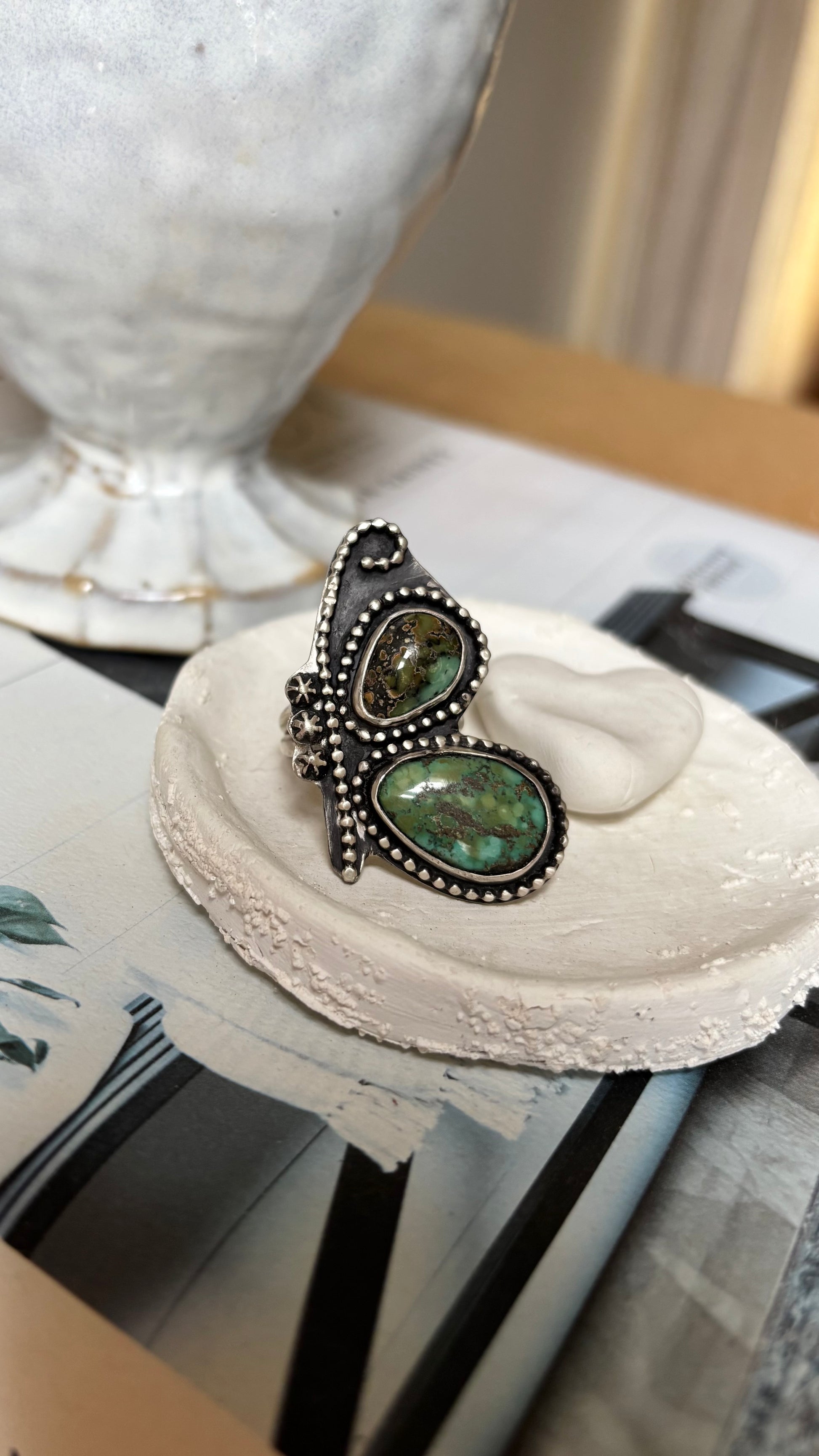 Butterfly ring is made with sterling silver, fine silver and turquoise with antiquing to make the design pop All handcrafted to resemble a half butterfly
