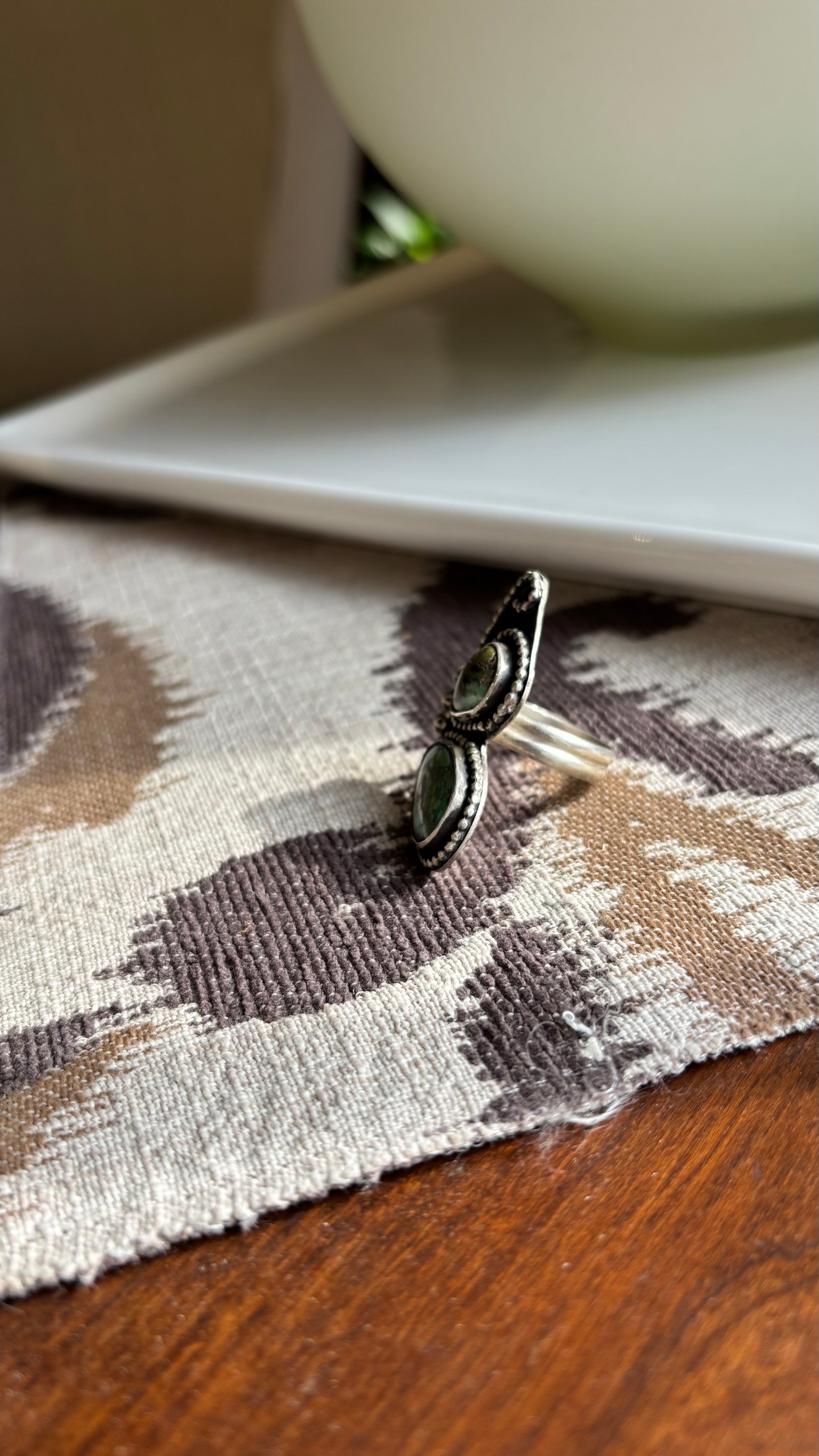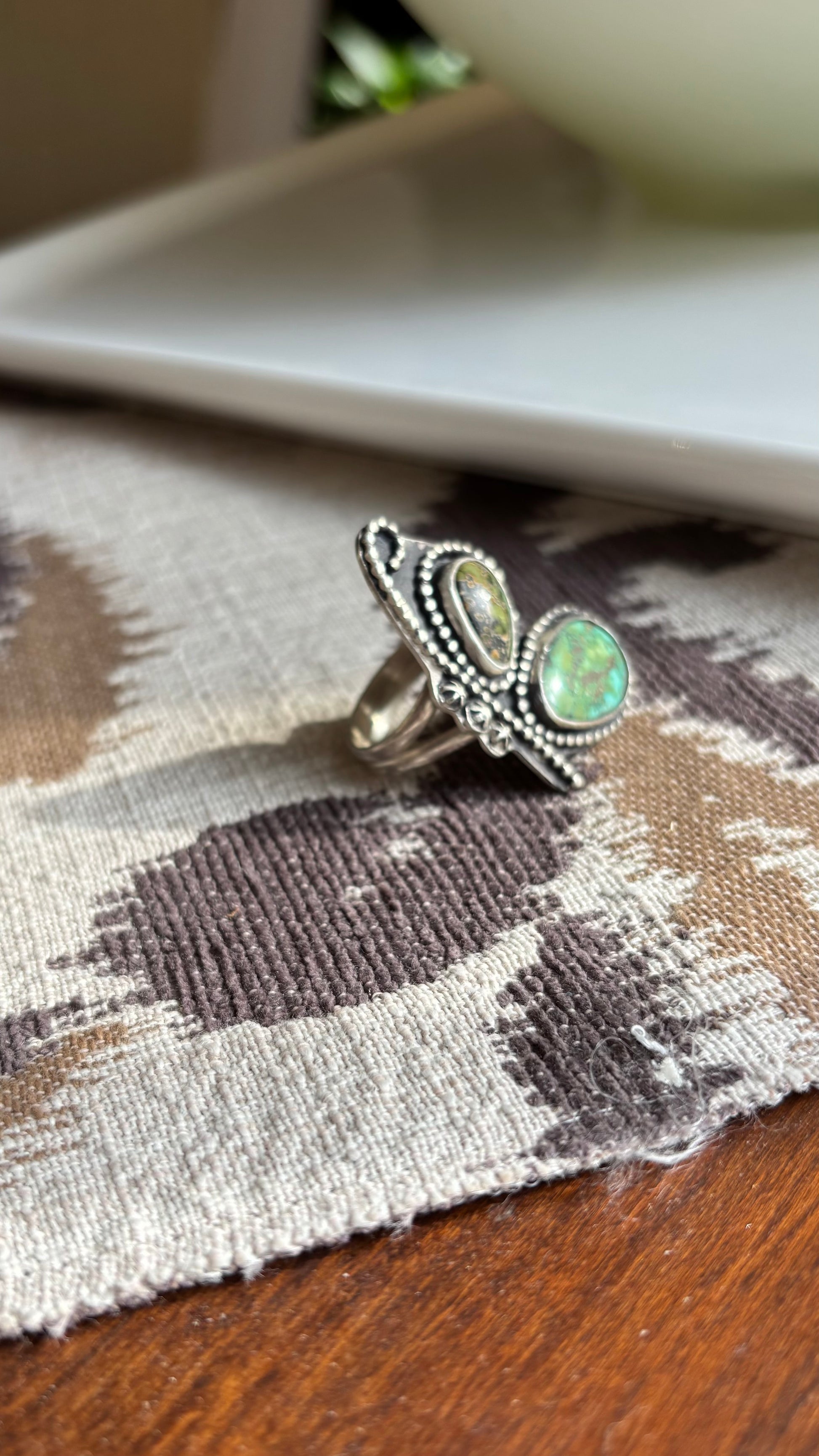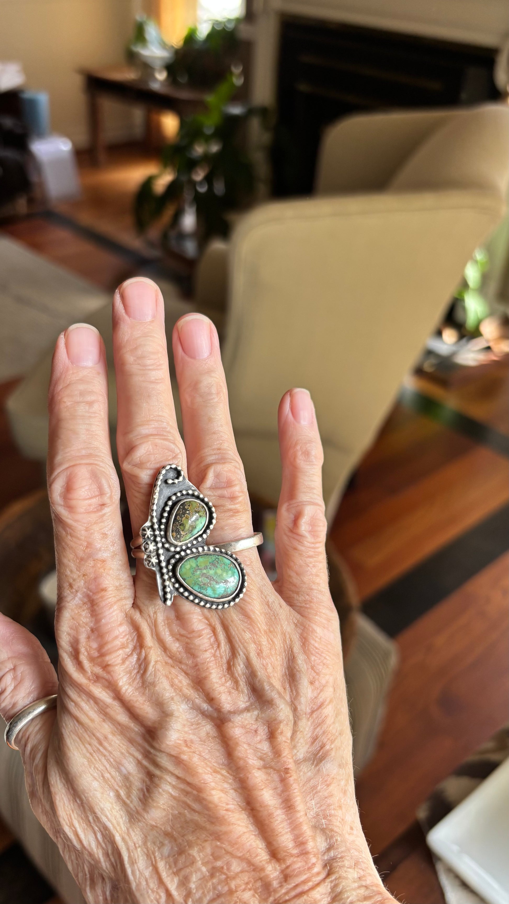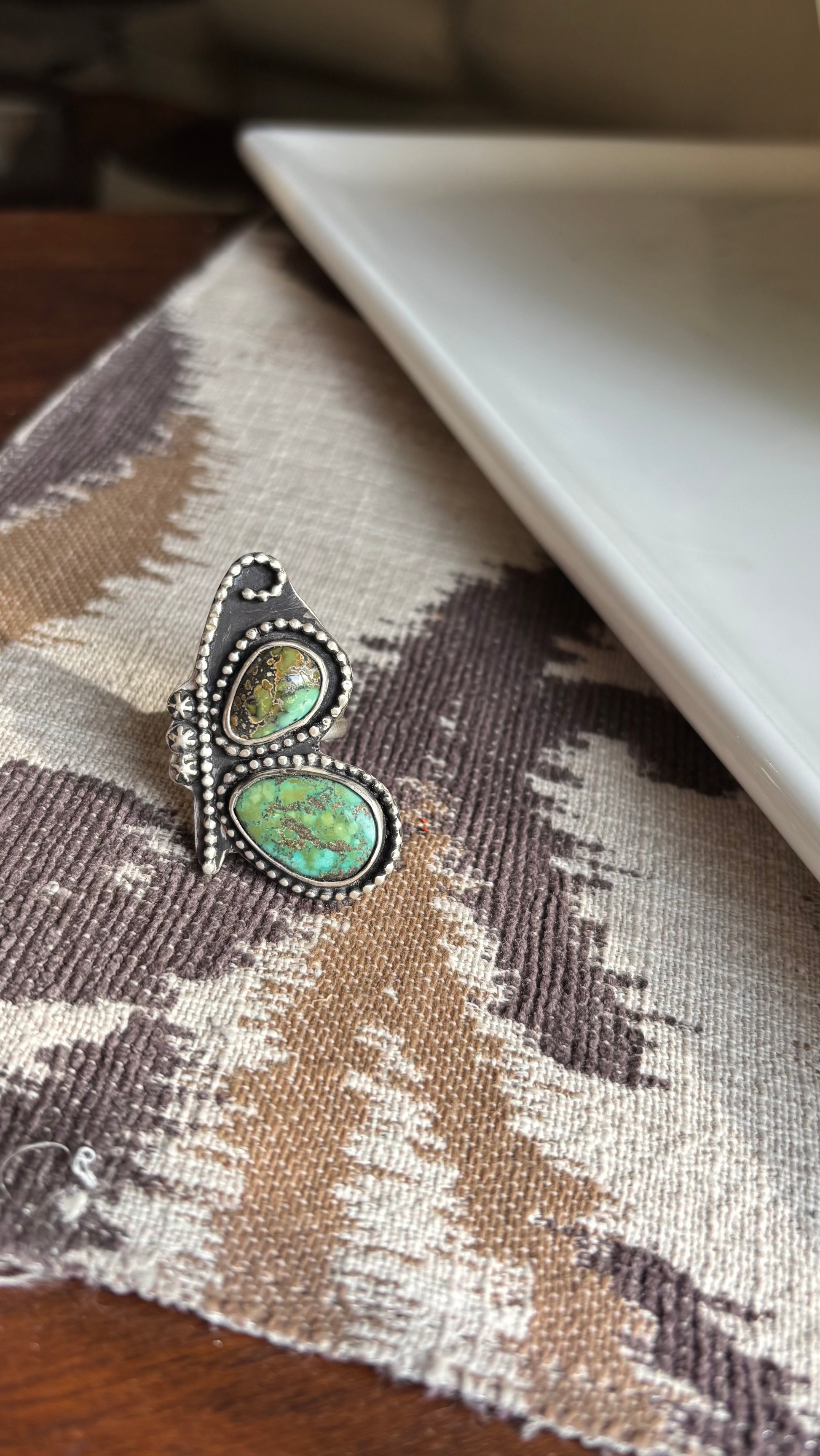 Butterfly ring is made with sterling silver, fine silver and turquoise with antiquing to make the design pop All handcrafted to resemble a half butterfly