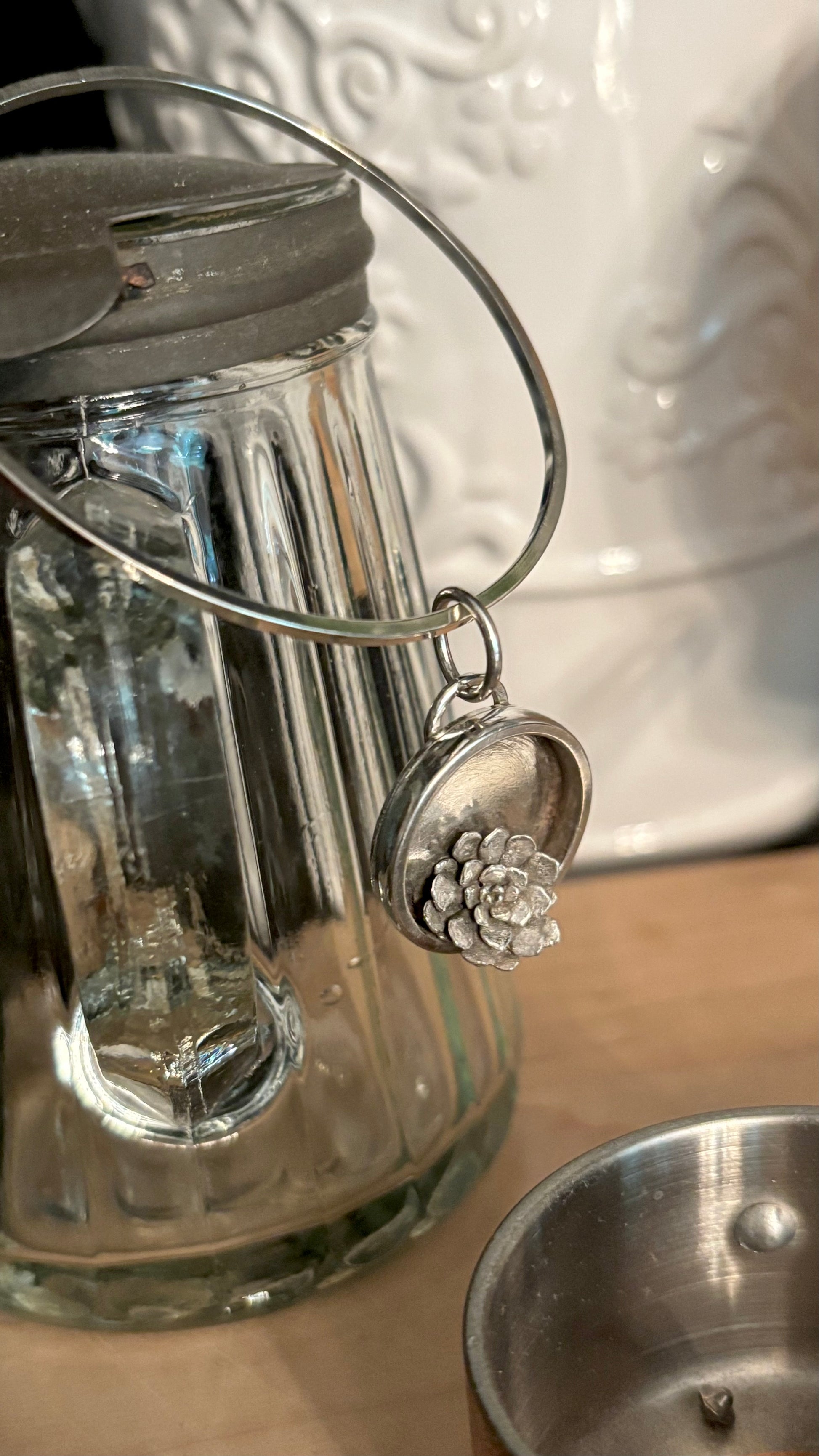 This is a sterling silver casting of a real succulent set in a shadow box antiqued to give dimension on a square wire bangle